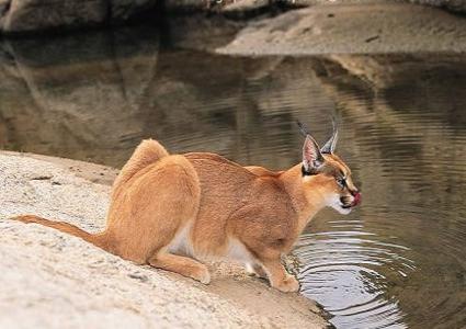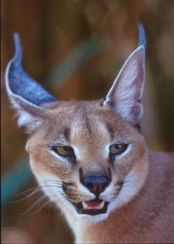 brown with distinctive tufted ears and white markings, around it's eyes and on it's throat chin and belly. The Caracal was once tamed and trained for bird hunting in Iran and India. They were put into arenas containing a flock of pigeons, and wagers were made as to how many the cat would take down. This is the origination of the expression " to put a cat amongst the pigeons." The Caracal is capable of leaping into the air and knocking down 10-12 birds at one time!