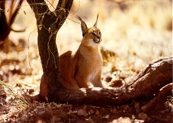 The Caracal feeds on rodents, small antelope, hares, birds and sometimes eat sheep and goats. It is mainly active in the morning and evening although during the hottest months it hunts at night.