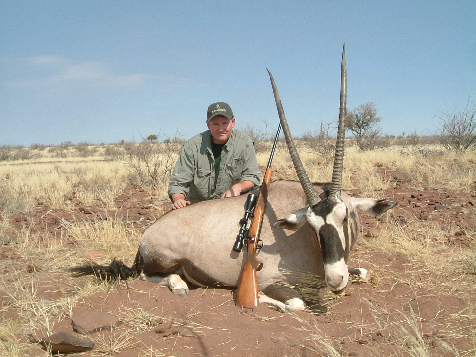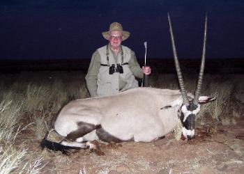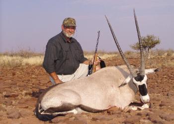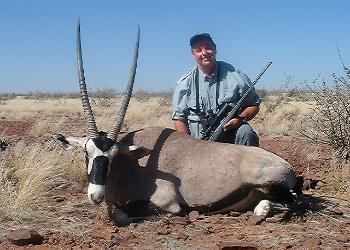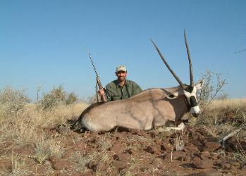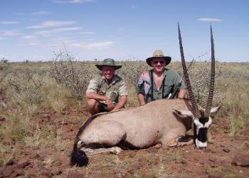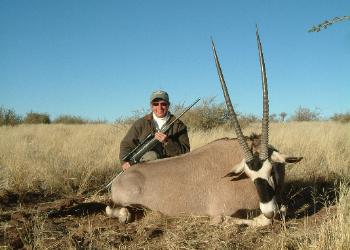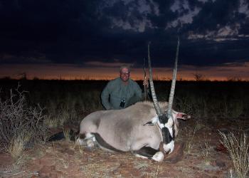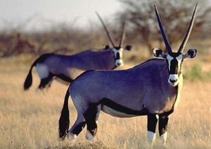 Both sexes have horns. Males and females are difficult to tell apart unless the udder or scrotum is visible. Males are slightly bigger and more heavily built than females. Their horns are thicker but shorter and blunt. Spends up to 60% of day inactive, in shade if possible to save energy and water and to avoid overheating. Body temperature is allowed to rise during the day, then excess heat is lost at night. Grazes for long periods at night when the moisture content of the vegetation is higher. Blood flowing to the brain is cooled by heat exchange with blood flowing from the nasal membranes in a network of vessels called the carotid rete. This cools the hypothalamus, which controls the body's heat balance. Both males and females are aggressive. Blows with the length of the horn and jabs with the tips are common, and Gemsbok usually stay more than a horns length apart.